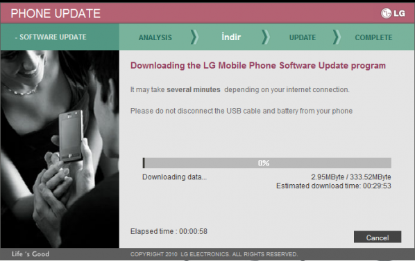 LG Optimus Black telefonunuzun bataryasını çıkartıp, USB kablo yardımı ile bilgisayarınıza bağlarken ses açma tuşuna basılı tutuyorsunuz ve karşınıza “S/W Upgrade Plase waitwhileupgrading” yazısı çıkana kadar ses açma tuşuna basmaya devam ediyorsunuz.